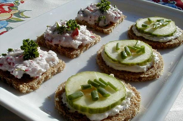 3. Spread cream cheese mixture, generously on each slice of cocktail bread, place slice of cucumber and sprinkle the top with dill.